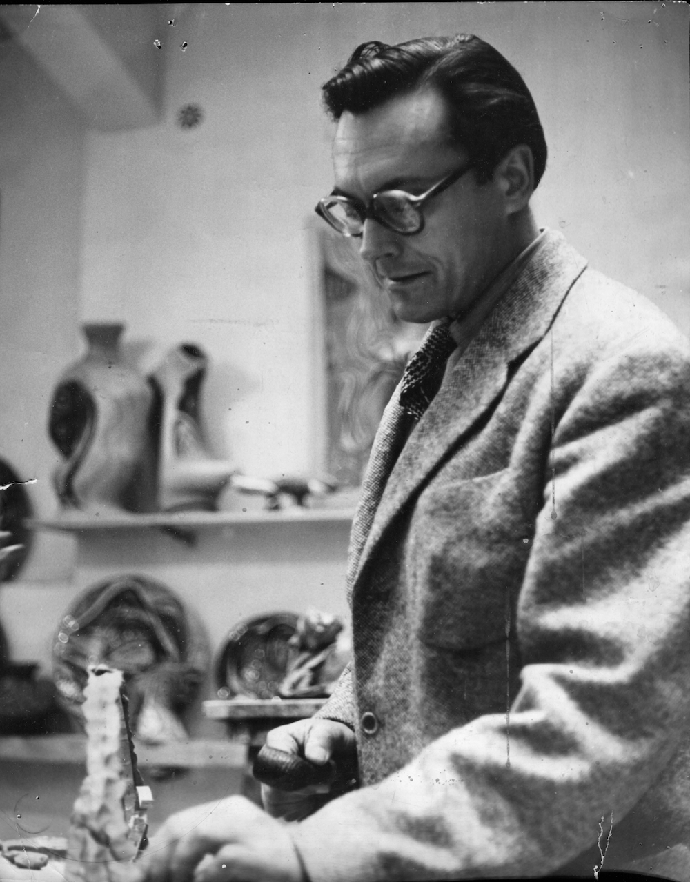 1953. Alberto Tavazzi nello studio del ceramista Salvatore Meli