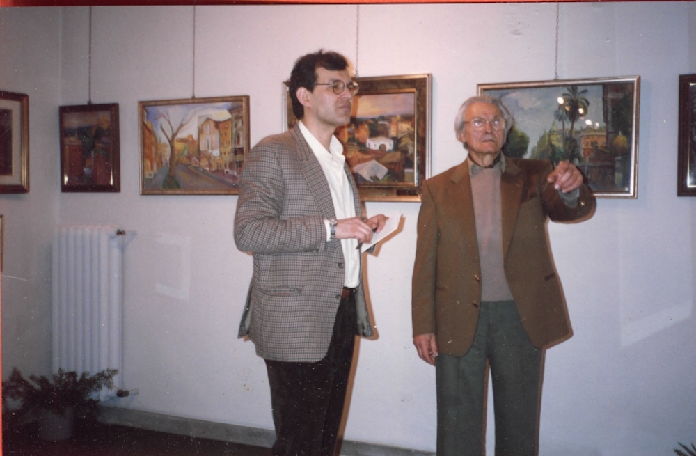 1990. Alberto Tavazzi alla galleria La Pigna con un giornalista
