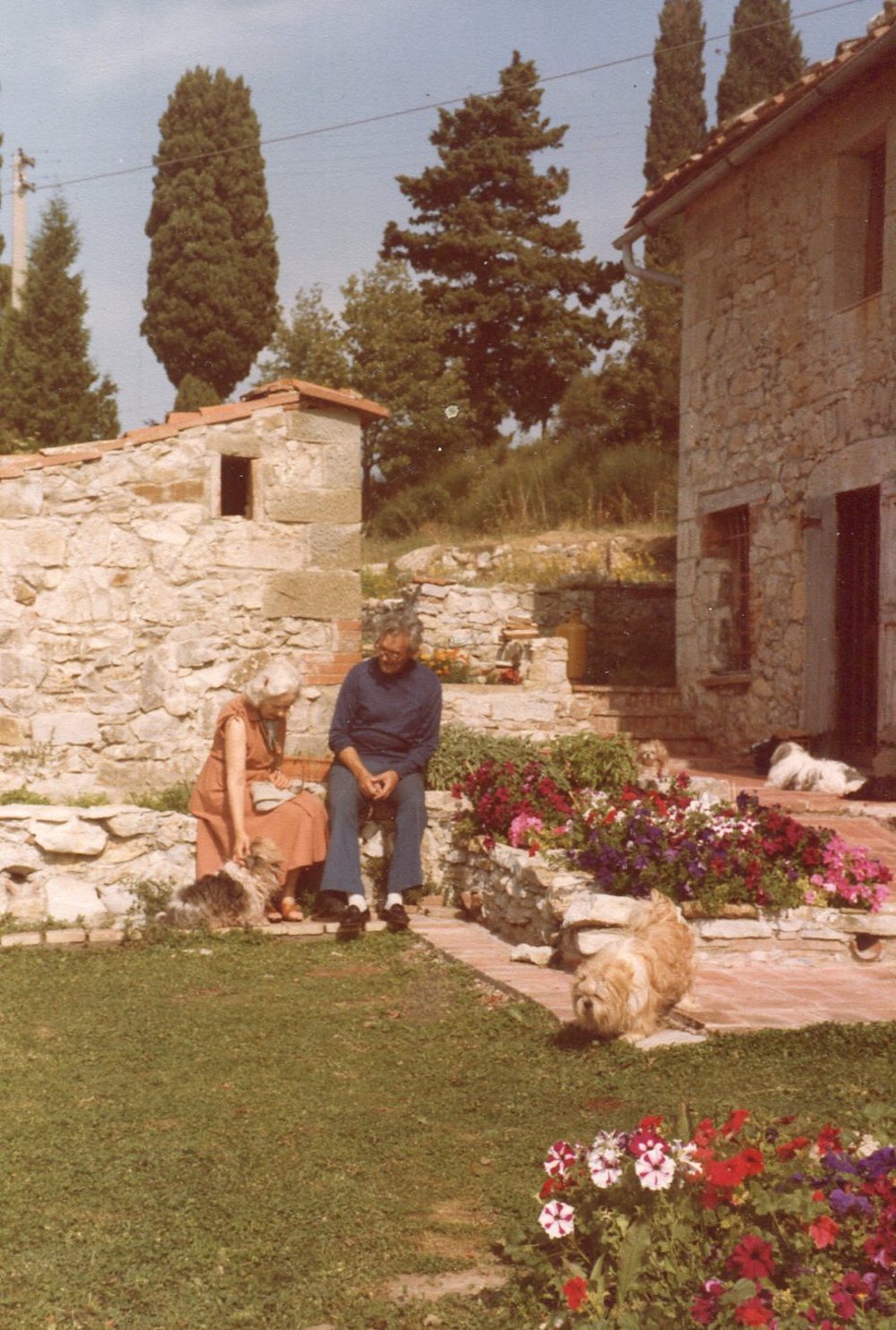 Anni ’80. Alberto Tavazzi con la moglie Bianca Maria Repton davanti alla loro casa nel podere l’Alberino a Vagliagli, Siena